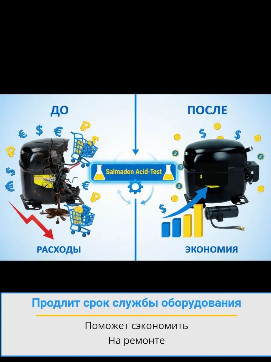 Тест Салмаден Acid-Test для определения кислотности холодильных масел с быстрым и точным результатом. Тестирует на кислотность все виды масел, безопасен, нетоксичен и негорюч.
